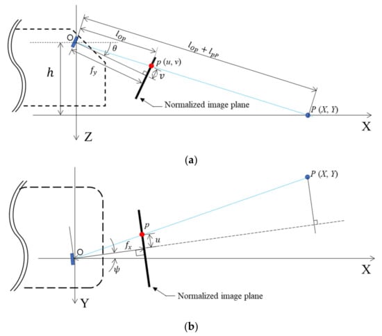 To examine whether the wheels will pass over the anomalies detected in the road-surface images, it is necessary to calculate the coordinates of the anomalies when each pixel of the image is subjected to ground projection. Figure 6a shows a point p in the pixel coordinate system of a road-surface image and the corresponding point P in the ground coordinate system. The two points lie on a straight line. If the pixel coordinate system changes depending on the camera focal length (f), principal point (), height (), and rotation angle (), the coordinates of point p in the pixel coordinate system—that is, (, )—will also change. Therefore, the coordinate system of point p was normalized to eliminate the inherent internal parameters of the camera, as shown in Equations (4) and (5):