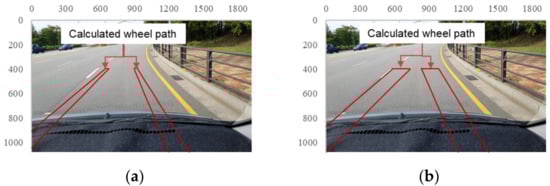 Because the front wheel tread of the SUV used in these tests was 1.685 m and the tires were 0.215 m wide, the wheels were located from −0.95 to −0.735 m and from 0.735 to 0.95 m from the longitudinal axis of the vehicle, as shown in Figure 5. In addition, because the camera was located 0.35 m from the longitudinal axis toward the passenger seat, the Y-axis coordinates of the wheels were located from −1.3 to −1.085 m and from 0.385 to 0.6 m in the global coordinate system. In Equations (8) and (9), , , and , which are related to the orientation of the smartphone camera, and , which describes the location of the wheels, all have known values. Thus, the normalized pixel coordinates (, ) can be calculated when a value is entered for by assuming that the vehicle is traveling in a straight line. Moreover, the pixel coordinates (, ) can be calculated using () and Equations (4) and (5). Figure 7a shows a road-surface image in which the calculated pixel coordinate values for the wheel paths on the road surface are indicated in red. The range of was then adjusted from 2.5° to 7.5° owing to the curved trajectory of the vehicle during its motion and the slight rotation of the camera. Based on these values, the areas corresponding to the wheel paths were determined as shown in Figure 7b.