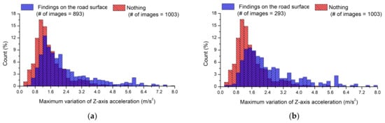 The vehicle acceleration in the direction of gravity (Z-direction) was mainly used to identify road anomalies in this study. This section presents the preprocessing applied to the smartphone acceleration data to obtain better results. Figure 9 shows the histograms for the maximum variation of Z-axis acceleration obtained corresponding to each image. Figure 9a shows a comparison of acceleration signals with and without road anomalies in the ROI after the acquired images were re-examined by the FCN model. The results without anomalies in the ROI are clearly the same as those in the range of 0–0.5 s in Figure 8. When there were road anomalies in the ROI, the average variation of Z-axis acceleration was 2.46 m/s2, and the median variation of Z-axis acceleration was 1.92 m/s2. It was difficult to distinguish between the maximum variation of Z-axis acceleration according to the presence or absence of road anomalies because similar ranges were observed. The distinction was particularly difficult to observe when the maximum variation of Z-axis acceleration ranged from 1.0 to 2.0 m/s2. Furthermore, it appears that distinguishing between the presence and absence of road anomalies in the ROI could be even more difficult using accelerations collected over the 0–1 s or 0–3 s periods.