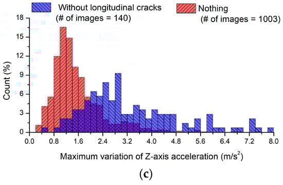 Histograms as a function of the maximum variation of Z-axis acceleration with and without detected cracks in acquired images: (a) Results depending on the presence of road anomalies; (b) Classification based on wheel paths; (c) Results obtained by excluding longitudinal cracks.
