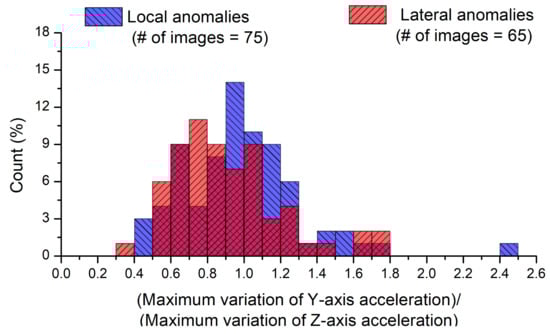 The ratio of the Y- to Z-axis accelerations was used as a criterion to distinguish symmetrical road-surface anomalies (such as lateral anomalies) from asymmetrical road-surface anomalies (such as local anomalies) by identifying the rolling of the vehicle [7]. The Y-axis acceleration may vary significantly when the vehicle passes over asymmetrical anomalies, but its change may be smaller for symmetrical anomalies. Figure 10 shows the histograms for the ratio of the maximum variation of the Y-axis acceleration to that of the Z-axis acceleration obtained during the driving test according to local and lateral anomalies. The acceleration data obtained from 140 road-surface images were used after the exclusion of those in which the wheels were expected to pass over a road-surface anomaly, longitudinal joint, or crack with only a small acceleration change. The maximum variation of Z-axis acceleration represents the maximum acceleration change from gravitational acceleration (equal to 9.81 m/s2) in the range of 0–0.5 s as aforementioned, whereas the maximum variation of the Y-axis acceleration represents the maximum acceleration change from 0 m/s2 in the range of 0–0.5 s. Figure 10 shows that the histogram obtained from the local anomalies is shifted to the right compared to the histogram obtained from the lateral anomalies, thus indicating a higher maximum acceleration variation ratio. An average value of 0.99 was observed for local anomalies and 0.81 for lateral anomalies. The histograms for the two conditions; however, were both contained within similar ranges between 0 and 2, and there was no significant difference between their distributions. Moreover, a t-test was conducted with a significance level of 0.05 for the two data sets shown in Figure 10. The calculated t-value was 0.25, and the threshold was 0.80; therefore, the difference between the mean values was not statistically significant. Several cases existed in which lateral anomalies were not symmetrical because they were obliquely situated. Even if lateral anomalies remain symmetrical, the Y-axis acceleration may vary significantly because the wheels on each side reach the lateral anomaly at different times depending on the direction of the moving vehicle, and the spatial orientation of the lateral anomaly.