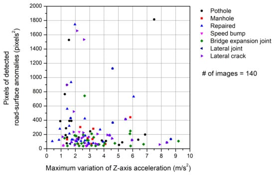 Figure 11 shows the relationship between the area (in pixels2) of the road-surface anomalies and the maximum variation of Z-axis acceleration. Only the results for the 140 road-surface images defined in Section 4.3 are shown. In general, the change in the Z-axis acceleration is expected to be larger as the size of the road-surface anomaly increases. It is difficult; however, to find any correlation between the two parameters in Figure 11. To identify the reason for the irrational relationship between the pixel size of the detected road-surface anomalies and the maximum variation of Z-axis acceleration, box plots are drawn for each parameter as shown in Figure 12 and Figure 13.