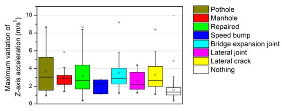 Box plots of the maximum variation of Z-axis acceleration for different road-surface anomalies.