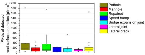 Box plots of the pixels of detected road-surface anomalies for different road-surface anomalies.