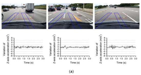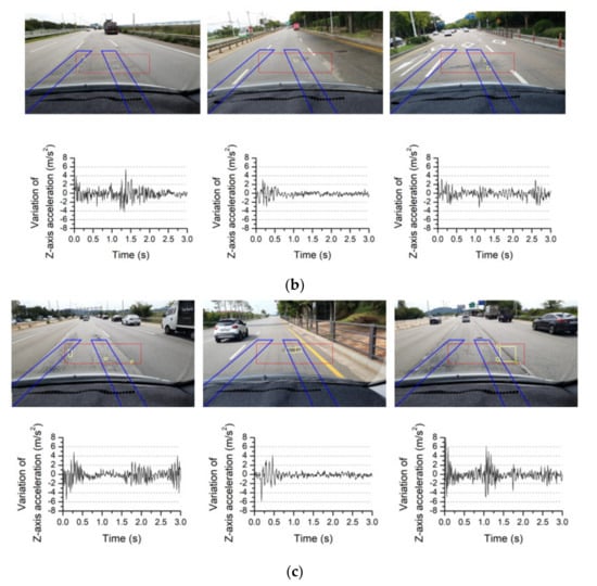 The acceleration data corresponding to the 140 images defined in Section 4.3 were classified according to the range of the maximum variation of Z-axis acceleration using quartiles of the data. The values of the first quartile (Q1 = 1.90 m/s2) and third quartile (Q3 = 4.2 m/s2) of the Z-direction maximum acceleration data were obtained and simplified to near-integer values. When the maximum variation of Z-axis acceleration was less than 2 m/s2, as shown in Figure 14a, values similar to the acceleration data in normal conditions were observed. Notably, cases in which small changes in acceleration appear to be caused by road anomalies located at the edges of the wheel paths were included in this case, as shown in the second image of Figure 14a. Figure 14b shows the road-surface images for which the maximum variation of Z-axis acceleration was between 2 and 4 m/s2. Anomalies that may affect the wheel paths can be detected, including a manhole and local anomalies, such as small potholes. Images in which the road-surface condition was generally uneven were also included in this case. Figure 14c shows the images for which the maximum variation of Z-axis acceleration was 4 m/s2 or greater. Anomalies that cause severe changes in acceleration and may require repairs can be frequently found in the driving path. In addition, changes in acceleration of 4 m/s2 or greater may occur when a manhole with a large height difference is passed or when the repaired road surface is uneven.
