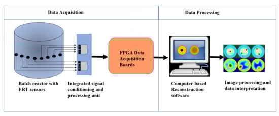 ERT hardware design and testing is an active field of research. The ERT machines for 3D data acquisition are regularly tested for speed and accuracy []. High-speed ERT and ECT systems using parallel computing on multi-GPU in a heterogeneous system [], FPGA electronics [,], with parallel and multiplanar ERT systems [], and rapid estimation algorithms using artificial neural networks [] have been designed to evaluate various process tomographic parameters.