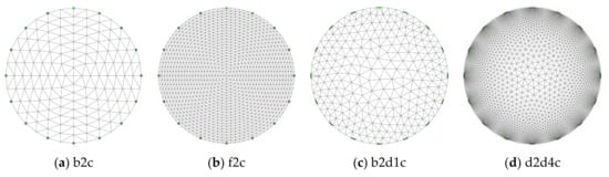 Prior to advancements in high-speed computation capabilities with modern computers, qualitative imaging in process engineering was performed using the ERT []. Many simulation studies in ERT data acquisition hardware and reactors have been performed to extract quantitative information. The study of the nature of current or voltage fields using electrode array simulation [] and the complex conductivity distributions in the ERT images using the Finite Element Model (FEM) mesh [] improved the analysis of the process data. Also, the entire batch reactor models were simulated to interpret the process progression []. Together with sensor simulations, the comparisons with experiments were performed [] to observe the voltage changes. The studies involving quantitative inverse modeling for the cylindrical object using various FEM meshes [] and improvement of sensitivity matrix for ERT [] and ECT [] showed interdependence of model design and accuracy of the estimations. In the study by [], two separated phantoms of radius 2 cm were evaluated using iterative Gauss–Newton (GN) methods and segmented with the Otsu and adaptive threshold segmentation method at various iterations. Figure 2 shows the different FEM meshes generated using EIDORS [,,]. The mesh elements can be of equal sizes, as shown in Figure 2a,b, or densely populated around the electrode, as shown in Figure 2c,d, which corresponds better to sensor spatial sensitivity. The nomenclature for the meshes is a standard used in EIDORS software.