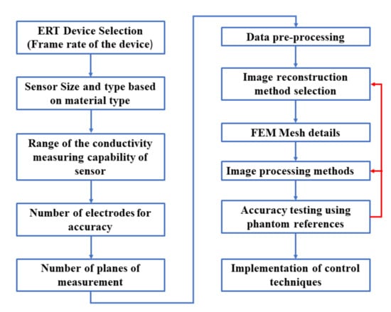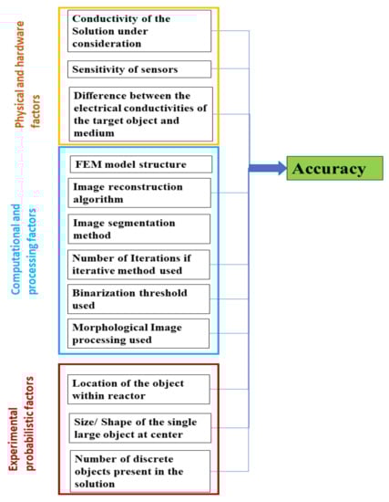 Geometric evaluations in hard-field tomography, such as industrial X-ray computed tomography, are done by using ruby spheres and the concept of radial pairs to evaluate accuracies and errors in the reconstructed images []. In soft-field tomography, such as ERT, many factors influence the quantitative accuracy in the spatial domain for the reconstructed images. Some of these factors are limited by the data acquisition system, and others due to various choices made in the data processing stages. Several factors according to which an engineer or an analyst can make a prior decision for a targeted quantitative evaluation using the ERT device are mentioned in Figure 3. For example, the methodology for the data acquisition can either be a V-C or a C-V []. A higher frame rate is required for the process technology involving a reaction crystallization, compared to the cooling crystallization. The contact impedance is determined by the size of the electrode, the material of the electrode, and its noncorrosive properties in the industrial environments.