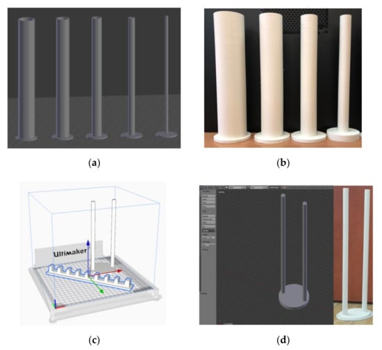 (a) Design of phantoms R1–R5; (b) 3D-printed acrylonitrile butadiene styrene (ABS) phantoms; (c) printing of sensor mounting unit and phantom R6; (d) design and print of phantom R6.