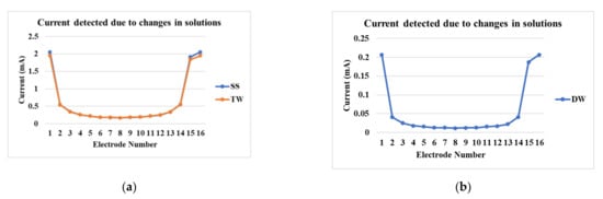 Figure 6a shows the currents detected at various electrodes for tap water and industrial-grade saturated sucrose solution. The detected currents are in the range from 0.25 mA to 2 mA. The differences between the currents detected for tap water and the industrial-grade saturated solution is minimal due to the use of tap water for sucrose production processes, whereas in Figure 6b, the demineralized water has the current range from 0.025 mA to 0.2 mA. It is clear from these results that our new signal conditioning unit is able to distinguish the small current magnitudes in the low-conductivity solution.