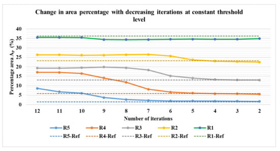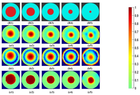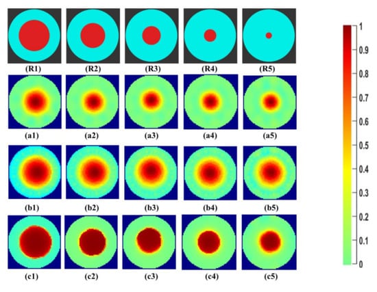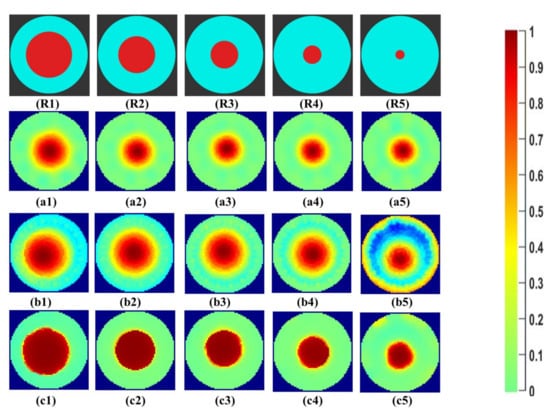 Initial qualitative analysis of the reconstructed images for the tap water solution for the phantoms R1 to R5 can be seen in Figure 7. The expected percentage area of phantoms inside the reactor, calculated from Equation (8), is given in Table 3. These values are ideal reference values calculated for phantoms with a circular cross-section inside the reactor. The first row, R1–R5, shows the reference images of the phantoms created using the CAD software Blender v 2.79. The areas of the phantoms and the beaker were designed with ideal diameters to be compared with the reconstructed images. The second row, a1–a5, shows the Gauss–Newton reconstructions for the image. In b1–b5, the reconstructions for the linear back projection method can be seen. In the last row, c1–c5 reconstructions using iterative total variations with ten iterations are presented. The number of iterations was set to ten for comparison purposes with other reconstruction methods. The lesser number of iterations did not provide a sharp boundary, as further studied in Section 4.2.