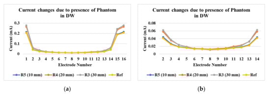 (a) Changes in current at various electrodes after phantom placement; (b) detailed view from electrode 2 to 14.
