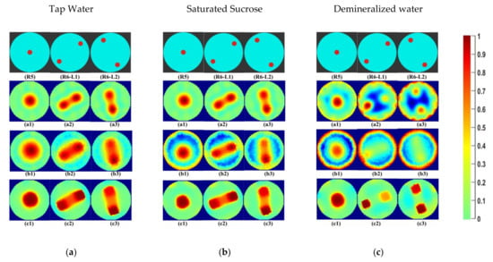 (a) Tap water; (b) industrial-grade saturated sucrose solution; (c) demineralized water: (R5, R6-L1, R6-L2) phantom reference; (a1–a3) Gauss–Newton reconstructions; (b1–b3) LBP reconstructions; (c1–c3) TV reconstructions at 10 iterations.