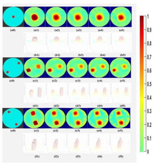 Initial qualitative results of the reconstructed images for the industrial-grade saturated sucrose solution for the phantoms R1 to R5 can be seen in Figure 8. The first row, R1–R5, shows the reference area represented by the phantoms. The second row, a1–a5, shows the Gauss–Newton reconstructions for the image. In b1–b5, the reconstructions for the linear back projection method can be seen. In the last row, c1–c5, reconstructions using iterative total variations can be seen for the ten iterations.