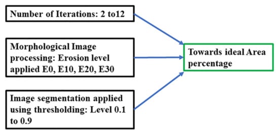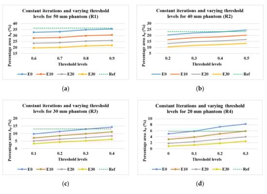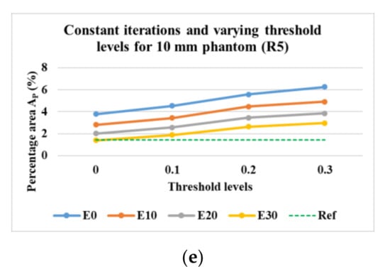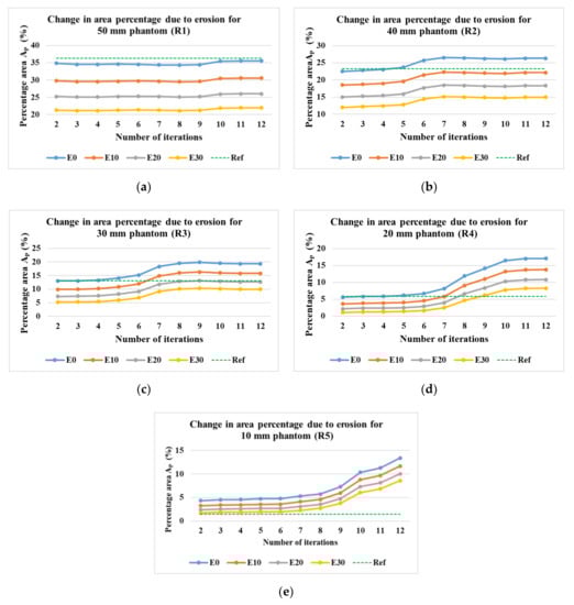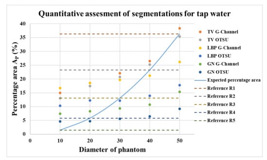 The quantitative assessments for segmentation using the G-Channel and Otsu method for tap water with the reconstruction algorithms TV, LBP, and GN are shown in Figure 14. The correlations for these percentage areas of phantom regions (AP) with phantom diameters (PD) and the expected percentage area of phantoms are shown in Table A1 in the Appendix A. The effect of applying erosion as morphological processing to obtain is shown in Figure A2a–e in the Appendix A. The E0 to E30 signifies the morphological image processing erosion applied. E0 stands for no erosion applied, and E10, E20, and E30 stands for incremental erosion applied using ‘disk’ operation in MATLAB image processing toolbox with 10, 20, and 30 as the radius, respectively.