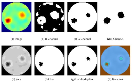 The extracted RGB color channels for phantom R6-L1 (location 1) in demineralized water are shown in Figure 15b–d. Additionally, image segmentation using Otsu, local-adaptive threshold, and the K-means method with three regions for phantom R6-L1 can be seen in Figure 15f–h. Otsu segmentation fails to detect the second phantom. With G-Channel segmentation, both the phantoms are visible with the binarization threshold set at 0.6. The binarization threshold can be varied from 0.1 to 0.9 and is used after extracting the green color channel (G-Channel) image.