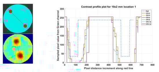 (a) Contrast profile plot for 50 mm phantom R1, reconstruction: TV, iterations: 2–12; channel: green. (b) Contrast profile plot for 40 mm phantom R2, reconstruction: TV, iterations: 2–12; channel: green. (c) Contrast profile plot for 30 mm phantom R3, reconstruction: TV, iterations: 2–12; channel: green. (d) Contrast profile plot for 20 mm phantom R4, reconstruction: TV, iterations: 2–12; channel: green. (e) Contrast profile plot for 10 mm phantom R5, reconstruction: TV, iterations: 2–12; channel: green. (f) Contrast profile plot for phantom R6-L1 (2 × 10 mm), reconstruction: TV, iterations: 2–12; channel: green, location: 1.