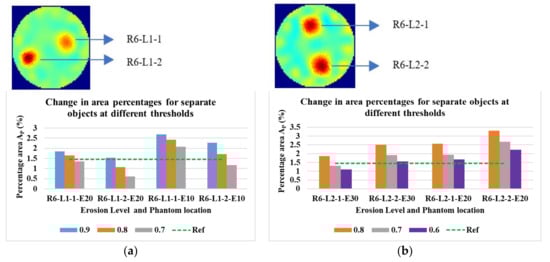 Table A1 shows the quantitative information for tap water along with correlation factors. The standard deviations of the percentage area of phantom regions evaluated by G-Channel and Otsu for all the reconstruction algorithms were calculated using STDEVA function in Microsoft excel. Corr PD shows the correlation coefficient of the evaluated percentage area AP with the phantom diameters. Corr. EA shows the correlation coefficient of the evaluated percentage area with the expected percentage area. The correlation coefficient was computed using MATLAB function corrcoef(). Factor ˄ was evaluated using the following Equation (A1). Higher ˄ signifies the higher deviations from the expected percentage area AP.