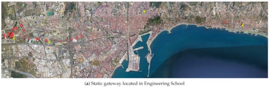 The developed application aims to analyze the operability of LoRa technology in an urban environment, using a hybrid network of concentrator nodes, which means that there are some gateways situated in fixed positions but also there is one mobile concentrator. Furthermore, several wireless sensors (end-devices), of different types, have been mounted on the vehicle that will act as the only mobile node of the network. This mobile node works both acquiring information and as a mobile sink, since it embarks a gateway besides the wireless sensors. LoRa modules have different probes in order to measure various environmental magnitudes from the surroundings of the vehicle and send them to the LoRa Network Server through both the embarked gateway and the static gateways around the city. Some of the LoRa modules include a GPS antenna in order to geo-locate each emitted data packet (current position of the vehicle), so every message sent by the sensor nodes onboard the vehicle can be traced even if they are not received by any static gateway (due to interference problems or obstacles). This serves to ensure that the emitted frames can be associated with an updated geo-localization, since the vehicle position is obtained thanks to a GPS node onboard the car. The goal is to provide coverage to the sensor nodes along the city of Málaga, a mid-sized city (around 500,000 inhabitants) in the Mediterranean coast of Spain. In order to sweep the maximum possible extension of the urban area, several gateways have been strategically placed on the roofs of various buildings, after having studied the distances and possible obstacles along the way. Each of these gateway sites is characterized by being at a different height, in a more or less complex environment and, consequently, have very different visibility. In total, five gateways have been set up in the city, after obtaining the necessary permits (Engineering School, Faculty of Tourism, El Ejido Government Pavilion and the International Spanish Centre, located in the neighborhood of El Palo), as well as the one located inside the vehicle (mobile transmitter/concentrator node). Thus, four fixed gateways and the mobile one have been used. The main goal of the system is to test LoRa technology in an urban environment. In order to do so, this work is structured around two views: