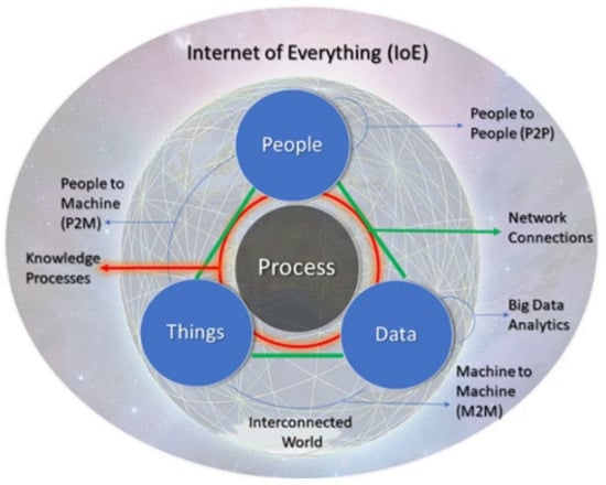 With more relevant connections than machine-to-machine communications, IoE has enabled the global democratization of skills, including person-to-machine and person-to-person connections [12,13].