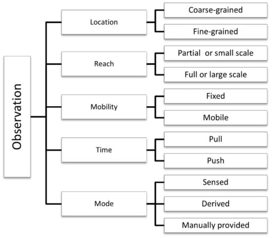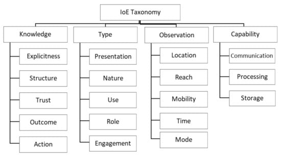 For this stage of development, we used the top-down development process, starting with defining the most general categories (knowledge, type, observation, and capabilities). We then selected dimensions and characteristics previously derived from a theoretical foundation from reviewing the related literature, as presented in Section 3 and grouped them in related knowledge, type, observation, and capabilities categories, revealing the resulting taxonomy. Our IoE taxonomy consists of four categories (see Figure 2) and groups 18 dimensions, each comprising of mutually exclusive and generally collectively exhaustive characteristics. Section 4.1 describes the knowledge category, which analyses the knowledge characteristics and the value created by IoE applications. Section 4.2 details sensor characteristics related to their use in IoE applications (types). Section 4.3 presents the observation category, which classifies how data are sensed and gathered in IoE observations. Finally, in Section 4.4, the sensors’ capabilities are classified into a few dimensions that address the technological aspects for designing IoE applications.