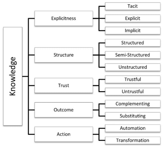 The knowledge category contains five dimensions related to knowledge creation and information flow: explicitness, structure, trust, outcome, and action. Each has its own specific sub-dimensions or characteristics, as shown in Figure 3.