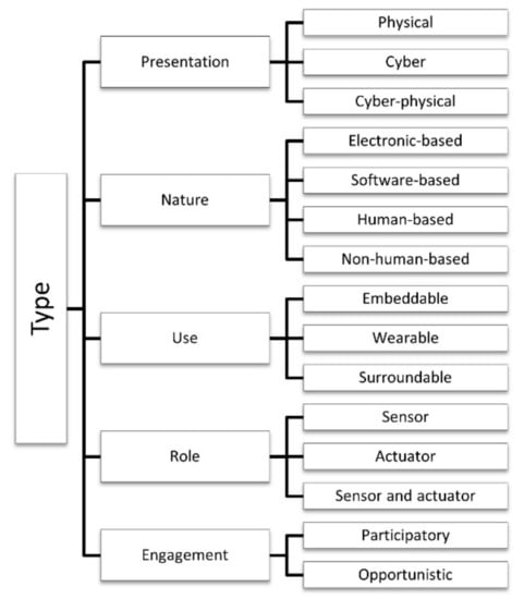 - Type: typifies sensors and actuators—who they are, their physical characteristics, their usage, and their role in IoE context: sensors or actuators in cyber, physical, or cyber-physical presentation;