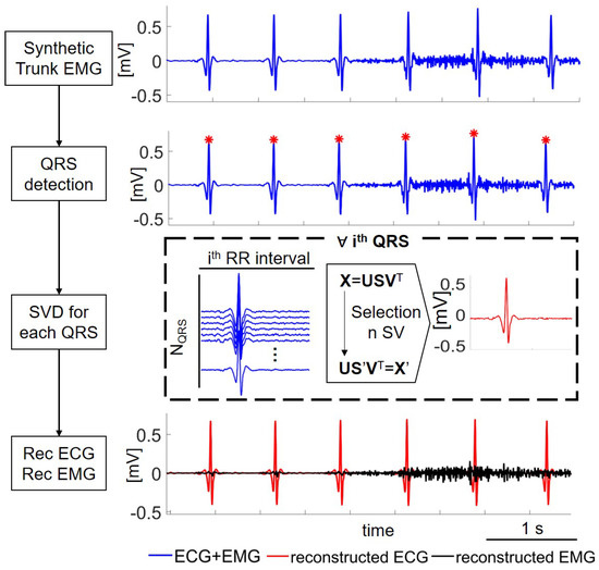 Schematic of the algorithm proposed with an illustrative synthetic trunk EMG (SNR = 10 dB). The EMG signal during the first three QRScomplexes was the minimum (rest phase), while the last three QRS were overlapped with the EMG at 50% maximal voluntary contraction (MVC). Firstly, the synthetic trunk EMG signal was processed to find the QRS complexes. For each QRS, a matrix X was built. Each row of X was composed by a single QRS centered 0.3 s before the R peak, with the length equal to the current RRinterval. Finally, the ECG component was extracted through inverse SVD considering n singular values, and it was subtracted from the mixed EMG.