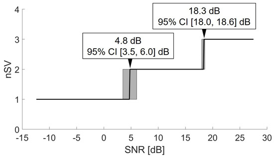 Calibration curve to establish the number of singular values to be used at each SNR level. The mean SNR and the 95% confidence interval are reported in the boxes.