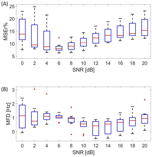 The median value of the MSEr in the time domain was below 16% for every value of the SNR (Figure 6A). The optimal performance of the algorithm was obtained with an SNR = 6 dB (MSEr = 8%). In the frequency domain, a median shift below 1.2 Hz of the mean frequency occurred for different SNRs (Figure 6B).