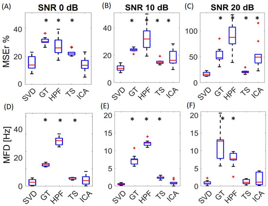 Performance of the different algorithms. SVD: singular value decomposition; GT: gating technique; HPF: high-pass filtering; TS: template subtraction; ICA: independent component analysis. The upper panels show the results in terms of the mean squared error (MSEr) with SNR of 0 dB (A), 10 dB (B), and 20 dB (C). The lower panels show the results in terms of the mean frequency difference (MFD) with an SNR of 0 dB (D), 10 dB (E), and 20 dB (F). * if p-value < 0.05 by the Bonferroni-corrected Wilcoxon test.