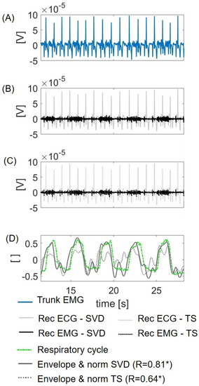 The algorithm was tested on diaphragmatic EMG as the illustrative trunk EMG signal. The subtraction of the ECG component estimated through the SVD algorithm (Figure 8B) allowed the extraction of the diaphragmatic EMG. The envelope of the diaphragmatic EMG (Figure 8D) resulted in a signal that was highly correlated with the respiratory cycle, as estimated with the inverted esophageal pressure (correlation coefficient R = 0.81, p-value < 0.01). The results obtained with the TS algorithm are also shown in Panels C and D as dotted lines (correlation coefficient R = 0.64, p-value < 0.01). The ICA algorithm also showed a moderate correlation (R = 0.69, p-value < 0.01).