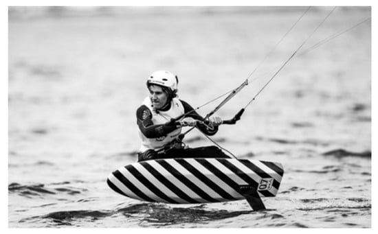 Kitesurfing is a surface water sport that combines aspects of other water sports such as sailing, surfing, windsurfing, wakeboarding, and paragliding. Since 1990, its popularity has grown exponentially, with 60,000 persons beginning to practice this sport around the world every year [1,2]. This sport requires great technical skills and is considered an extreme sport. In it, the sailor is powered by using a kite that is used as a sail and glides over water by using a board. This kite is controlled with a bar and, by means of lines of ropes, it is kept at a distance of about 25 m from the sailor. The kitesurfer can reach speeds of up to 30 knots, depending on the wind speed, the size of the kite, and the state of the water surface. In kiteboarding races, the main disciplines recognized by the International Kiteboarding Association (IKA) are the course racing, freestyle, wave, slalom, and speed [3]. The energy demand is determined by the type of discipline practiced by the sailor, and the course racing discipline can be considered as an activity of moderate intensity. It is characterized by the low increase in lactate levels and maximum oxygen consumption, but with a large increase in heart rate when the wind speed is low (12 to 15 knots) [4]. In the course racing discipline, the sailor must complete a regatta in the possible shortest time, sailing upwind and leeward in a regatta circuit bounded by buoys.