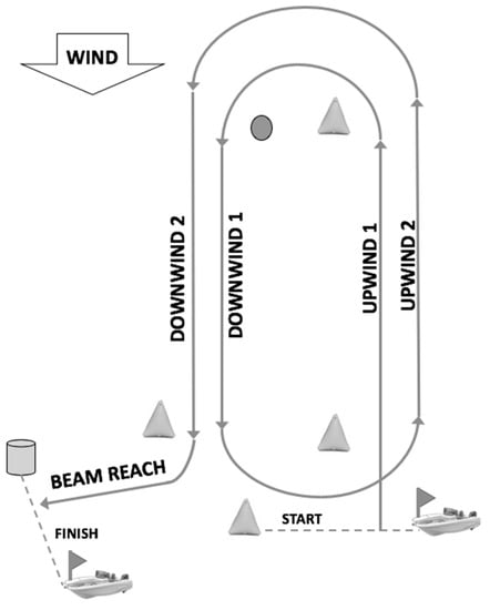 The race course consisted of 4 windward/leeward legs, and the true wind was at right angle to the sailing craft, with lengths appropriate for the condition, with 2 in windward (upwind), 2 in leeward (downwind), and 1 in beam reach (Figure 2). A total of 17 races were analyzed: 5 races in Melbourne, 6 in Santander, and 6 in Marseille.