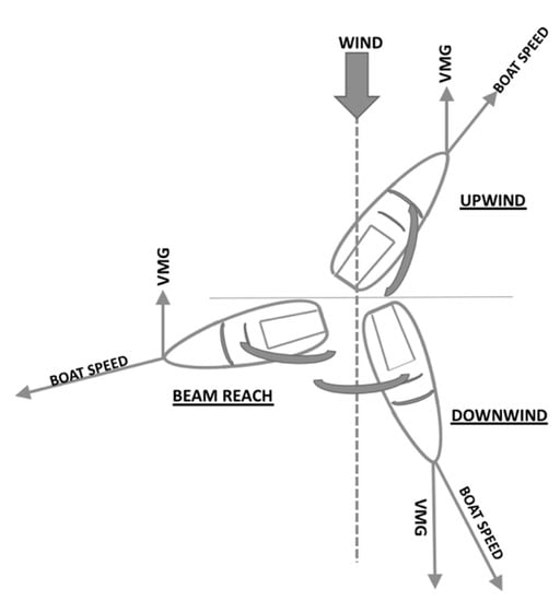 VMG determines the performance of the board according to the maximum speed it can reach as a function of the course, and it considers the vertical component of the speed with respect to the wind direction [31]. This velocity is the best combination of the speed and sailing angle, making the board advance as far as possible [40,41] (Figure 3).