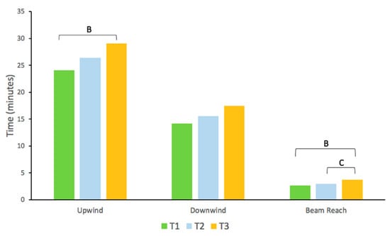 Comparison between the groups of sailors with different performance levels (T1, T2, and T3) in upwind and beam reach for time. B: statistically significant difference between T1 and T3; C: statistically significant difference between T2 and T3; T1: high-level sailors; T2: medium-level sailors; T3: low-level sailors.