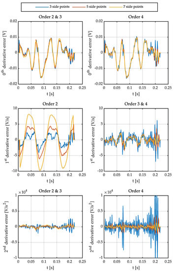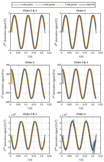 Then, the sine is fitted to polynomials of different orders and number of side points. This way, polynomials of order 2, 3, and 4; and 3, 5, and 7 side points are represented in Figure 1 and Figure 2. It is important to point out that matrix g has some interesting characteristics depending on the order of the polynomial. The convolution coefficients for the zeroth and second-time derivatives are identical in the case of polynomials of order 2 and 3, as well as 4 and 5. Similarly, in the case of the first and third-time derivative, the polynomials of orders 1 and 2 are the same, and those of orders 3 and 4 are equal too. Therefore, polynomial fitting of order 2 is not shown in Figure 1 and Figure 2 for the zeroth and second time derivative (it is identical to third order) and the fourth-order polynomial is not shown for the first time derivative (identical to third order). In the case of Figure 3, all orders of the polynomials are shown since time derivatives zero, one, and two are combined.