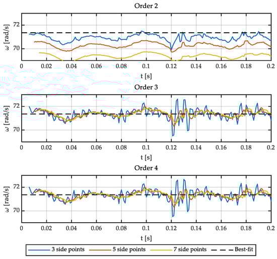 Therefore, it is necessary to differentiate the sensor signals to obtain both the angular rotor speed and acceleration. To do so, the Savitzky-Golay (SG) filters [45,46] are used to filter the signals and determine their time derivatives. These filters optimally fit a set of data points to polynomials of different orders. In order to use this tool, the points have to be equispaced in time and cannot have discontinuities. Some of the advantages of this method include the following: