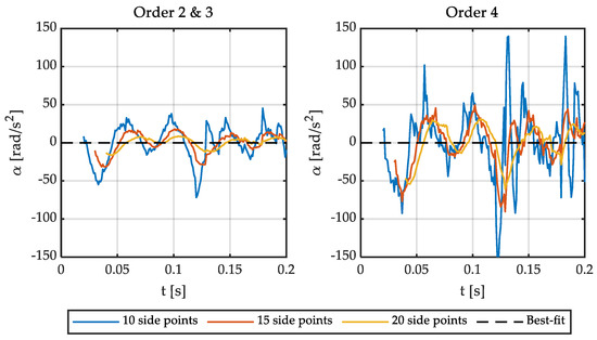 Figure 4. Angular acceleration fitted to polynomials of order 2, 3, and 4 with 10, 15, and 20 side points.