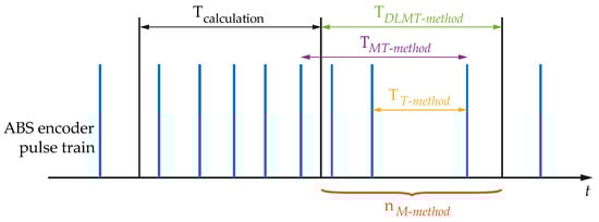 where ωABS is the measured angular speed, x is the number of pulses that entered during T A B S M T , p is the number of pulses of the ABS encoder, T A B S M T is the time gap between the last pulse of the previous calculation period and the last flank (see Figure 5). This time is measured by counting ticks within two pulses with a 1 MHz clock. The subscripts “ABS” and “Sin-Cos” are used to indicate that the signals come from the ABS encoder and Sin-Cos encoder respectively.