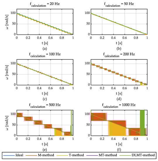 First, the following analysis has been made to determine the calculation frequency (fcalculation) of the angular speed from the ABS encoder. To do so, the angular speed given by the linear function ω(t) = 100 − 100 t, t [0, 1] has been simulated. The digital signal of the ABS encoder was sampled at fsample,ABS = 1 MHz. The angular speed was calculated at six different frequencies, namely: fcalculation,ABS = 20, 50, 100, 200, 500, 1000 Hz. The angular speed has been determined for each of these six frequencies using four aforementioned methods. The term “Ideal” is used in the following figures to define the reference magnitude. The results are shown in Figure 6.