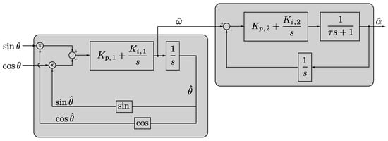 On the other hand, speed and angular acceleration with sinusoidal transducers can also be determined using a closed-loop dual-PLL configuration [38,39]. Figure 8 shows an outline of this approach. It consists of a first loop to determine angular velocity ( ω ^ ) and position ( θ ^ ) and a second loop, with a similar structure, to determine angular acceleration ( α ^ ). This second loop includes a first-order low-pass filter with time constant (τ). Five parameters have to be set, namely: Kp,1, Ki,1, Kp,2, Ki,2, τ. These parameters should be tuned, taking into account the noise of the signals coming from the Sin-Cos encoder, the maximum allowable delay and the sampling frequency, among others.