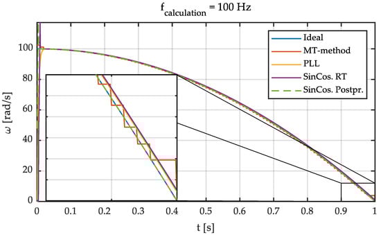 Based on these previous results, an intermediate calculation frequency of 100 Hz has been chosen for the simulations and the experimental tests. This frequency is considered appropriate for traction and braking control applications since it shows a good balance between accuracy and measurement delay. Next, the comparison between the aforementioned methods is shown. To do so, simulations were carried out reproducing a braking process. Figure 7 shows the results obtained for an input angular speed given by the linear function ω(t) = 100−100 t. The following default parameters were set: fsample,ABS = 1 MHz, fcalculation,ABS = 100 Hz, fsample,Sin-Cos = fcalculation,Sin-Cos = 1 kHz. The number of pole pairs (i.e., pulses per revolution) of the ABS encoder is 176.