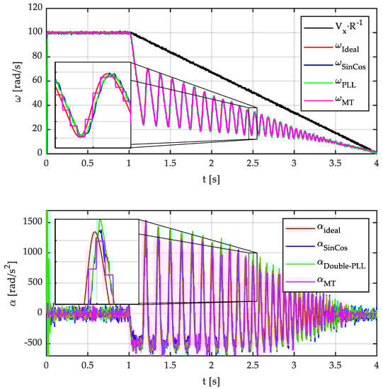 Figure 15 shows both the angular speed of the wheel and the linear speed of the belt while Figure 16 shows the angular acceleration of the wheel. Both magnitudes have been calculated through the three different methods previously described: MT, PLL, and SinCos. For verification purposes, the angular speed obtained using 15 side points and a polynomial of order 3 will be used as a reference in the experimental tests (ωref and αref). This reference angular speed is obtained by postprocessing the measured signal with the parameters previously described. As shown previously in Figure 7 and Figure 9, the nondelayed angular speed and acceleration calculated by a convolution and more side points can be considered the reference angular speed since the error in the simulations is negligible. The following conclusions can be drawn from the observation of these results: