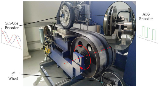 These comparative tests require the use of two sensors of different technologies: incremental magnetic encoder also called in the automotive field “ABS encoder” (Figure 12), and absolute encoder Sin-Cos. The former was placed beside the brake disk while the latter was already installed on a Kistler RoaDyn P625 wheel force transducer used in this test bench (Figure 11). Finally, A 5th wheel equipped with a high-end incremental magnetic encoder with 4000 pulses per revolution was used to measure the linear speed of the belt.