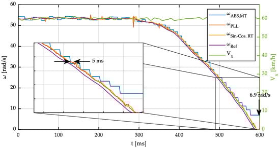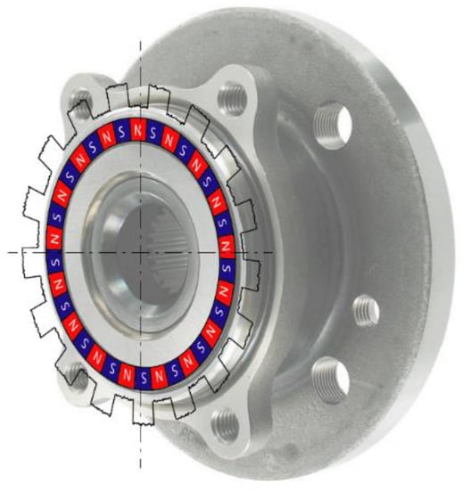 The proper determination of the angular speed of vehicle wheels is of particular importance for active safety systems: Anti-lock Braking Systems (ABS), Traction Control System (TCS), Electronic Stability Program (ESP), etc. [1]. The information from the wheel speed sensors is used as an input parameter to traction and braking control systems [2,3,4]. Tire longitudinal traction and braking forces depend essentially on the slip ratio, which is the relationship between wheel peripherical speed and the linear speed of the vehicle [5,6,7]. In the field of brake control systems, it is crucial to determine the angular speed of the wheels in medium and low-speed conditions [6,8,9]. This is because ABS prevents the wheels from locking, so it is required to determine whether the wheel is moving slowly or if it is already locked.
