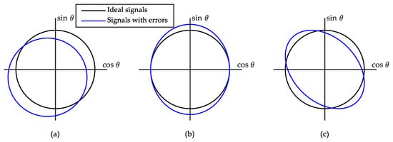 Regarding the errors in the signals coming from the Sin-Cos encoder, three error sources can be identified [36], namely: offset between the magnet and the sensor (Figure 13a), different gain for each signal (Figure 13b), and delay in the acquisition of the signals (Figure 13c).