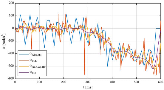 It can be seen that experimental results confirm the results obtained in simulations. This way, the MT method does not provide accurate measurements at low speed. Furthermore, highly noisy accelerations have been obtained. The PLL-based method and the S-G filter provide low-noise robust speed estimates. In addition, angular accelerations provided by both methods show a reasonably good correlation with real values.