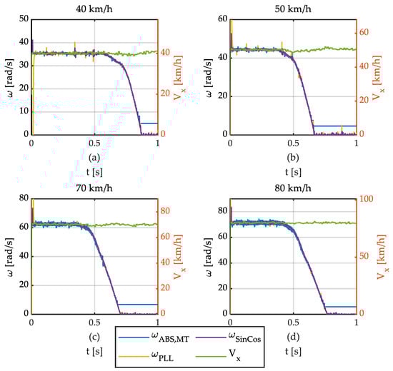 As a summary and as an innovative contribution, it is important to note the following: the signals from a Sin-Cos encoder are time differentiated through the Savitzky–Golay filter. This way, the angular speed can be obtained in real-time with a reduced computational cost. Results show that improved estimates can be obtained with the proposed method. The performance of the Sin-Cos Method exceeds that of the most widely used commercial methods. Thus, it provides robust and accurate results from very low to high speeds. Current ABS encoders are not able to accurately measure or estimate wheel velocity in low speed conditions, which leads to poor wheel slip calculation. Consequently, the ABS is deactivated for speeds below 10–15 km/h, jeopardizing vehicle safety in braking maneuvers. The improved performance of the proposed method contributes to a better calculation of the wheel slip at low speed, thus enhancing ABS performance. This result shows that the use of this method can lead to the control improvement of ABS systems in vehicles.