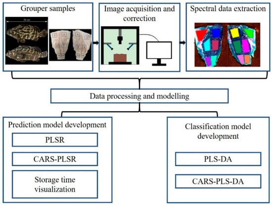 Therefore, the specific objectives of this study are to (1) analyze the average hyperspectra of different parts of pearl gentian grouper, and select suitable parts for follow-up research; (2) establish partial least square discrimination analysis (PLS-DA) and competitive adaptive reweighted sampling- PLS-DA (CARS-PLS-DA) models to identify fresh, refrigerated, and frozen–thawed pearl gentian grouper; (3) establish PLS regression (PLSR) and CARS-PLSR models to predict the storage time of pearl gentian grouper stored at room temperature, refrigerating and freezing; and (4) visualize the storage time of each pixel of fish under different storage conditions.